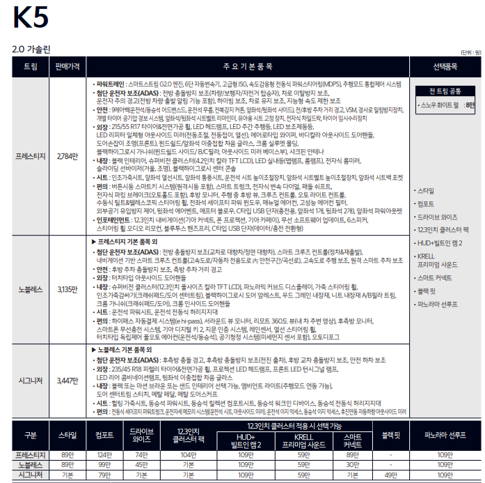 기아 K5는 다양한 트림과 옵션으로 소비자들에게 선택의 폭을 넓히고 있습니다. 기본적으로 프레스티지, 노블레스, 시그니처 트림이 제공되며, 각 트림은 소비자의 필요에 따라 다양한 기능을 선택할 수 있게 설계되었습니다. 예를 들어, 프레스티지 트림은 기본적인 안전 및 편의 사양이 포함되어 있지만, 노블레스와 시그니처 트림으로 올라가면 보다 고급스러운 디자인과 추가적인 편의 기능을 경험할 수 있습니다.